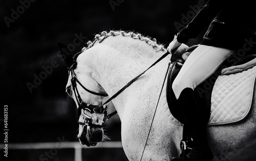Fototapeta premium The black-white photo captures a white horse with a braided mane and a rider in a saddle as they compete in a dressage competition. The beauty of the horse and rider, as well as the competitive sport.