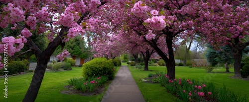 © ckybe, Naklejka premium The blossoming cherry blossom tree path dances like petals in a peaceful japanese garden breeze