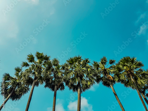 © Jhowrock, Obraz premium The blue sky in the evening and the many palm trees.
