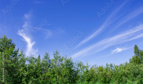 Obraz premium The blue sky is patterned with white clouds. Green forest