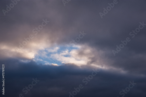 Naklejka premium The blue sky looks out among the dark winter clouds