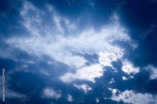 Fototapeta premium The blue summer sky with white fluffy clouds. Photo from window on the airplane.