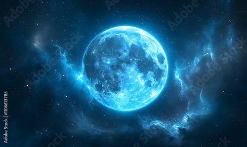 © dewpra, Fototapeta premium The blue supermoon casting a shimmering blue reflection or light effect on an abstract