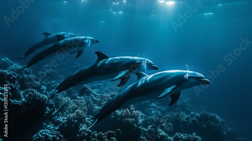 © Black, Fototapeta premium The Blue Symphony of Dolphins Chasing Waves