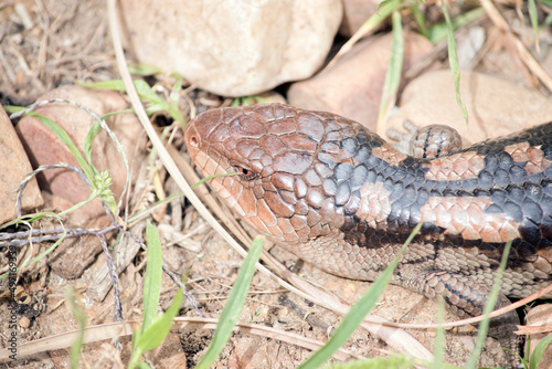 © susan flashman, Fototapeta premium the blue tongue lizard is black and tan