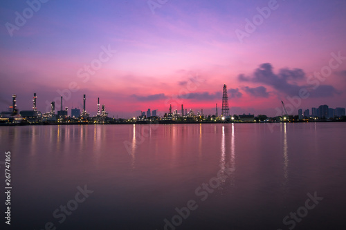 © bangprik, Naklejka premium The blurred background of nature along the river, with views of the cargo ship, oil refinery, sunrise and beautiful sky in the morning