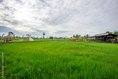 © bangprik, Obraz premium The blurred background of the wooden bridge that walks around the green rice field scenery, and the cool breeze while traveling.