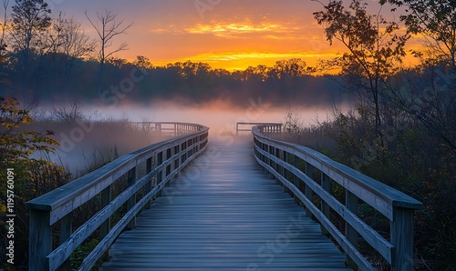 © dewpra, Naklejka premium The boardwalk in Wawayanda State Park bathed in the warm hues of sunrise