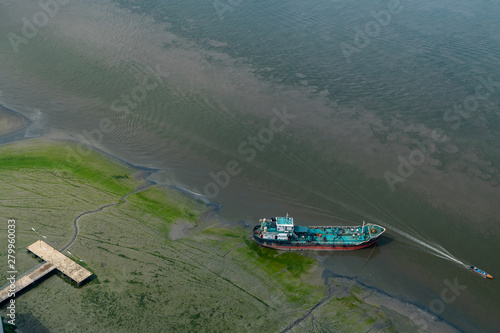 © num, Obraz premium The boat docked in Chao Phraya River in the afternoon, Top view.