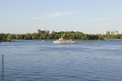 © alexmal, Naklejka premium The boat sails slowly along the river