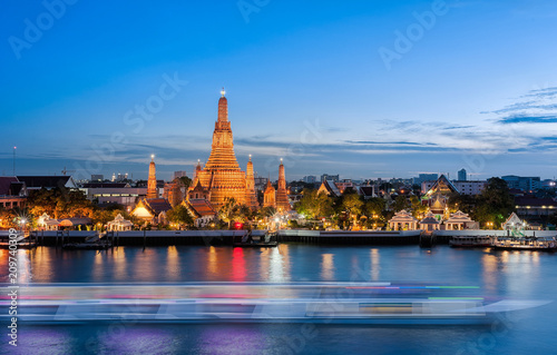 © Theerawat, Obraz premium The boat was sailing in Chao Phraya River, background Wat Arun at sunset time ,Bangkok, Thailand. The Temple of Dawn