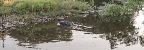 Fototapeta premium the body of a man who drowned lies face down in the water, the lifeless body of a murdered young man on the river at low tide at sunset