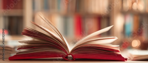 © Boh, Obraz premium The Book Open on a Table with Blurred Library Background Evoking Warm Study