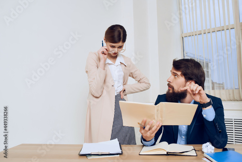 Fototapeta premium the boss sits at the desk next to the secretary work team professionals