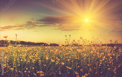 Naklejka premium The boundless field and blooming colorful yellow flowers.