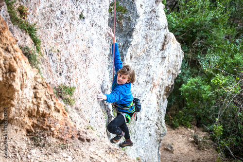 Fototapeta premium The boy climbs the rock.