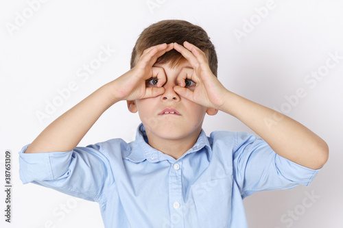 Naklejka premium The boy expresses emotions, looks through his hands, like through binoculars. Isolated on white background.