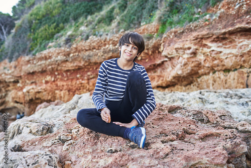 © Nedrofly, Naklejka premium The boy looking at camera is sitting on a rock by the sea.