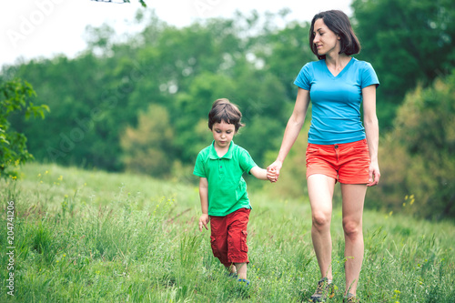 © zhukovvvlad, Fototapeta premium The boy walks with his mother in the meadow.