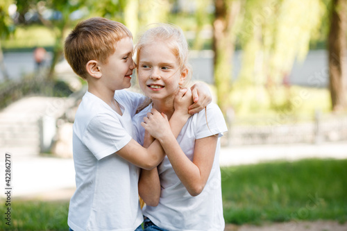 © Ekaterina Pichukova, Fototapeta premium The boy whispers a secret in the girl's ear. Children for a walk in the park.
