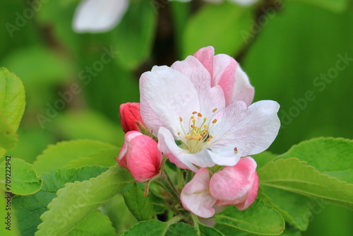 © Dynamoland, Obraz premium The branch of a blossoming tree. Spring apple blossom in Germany