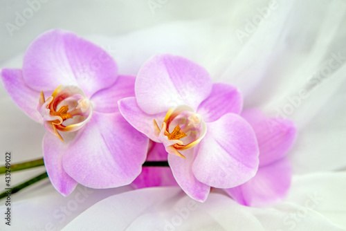 © licvin, Obraz premium The branch of purple orchids on white fabric background