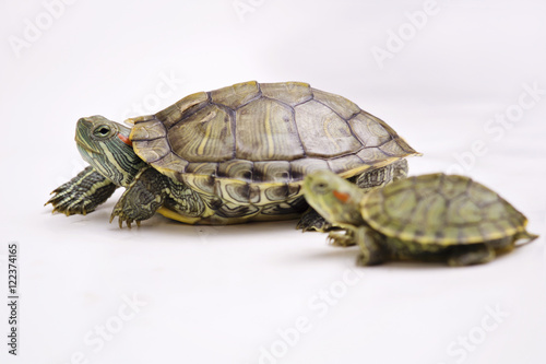 Obraz premium The Brazilian Red eared slider turtles with white background