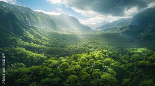 © AkuAku, Naklejka premium The breathtaking aerial perspective showcases a lush forest nestled among majestic mountains against a backdrop of serene natural beauty