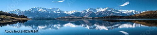 © Say, Naklejka premium The breathtaking view captures the essence of tranquility with snow-capped mountains rising majestically in the background while their pristine reflections shimmer in the perfectly still lake below.