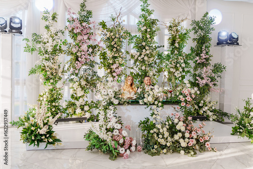 © andrey, Fototapeta premium The bride and groom at the newlyweds' table, decorated with many flowers.