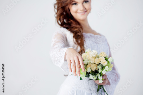 © Ulia Koltyrina, Naklejka premium The bride extends her hand, beautiful smiling woman in a wedding