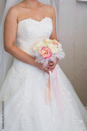 Naklejka premium The bride holds a beautiful wedding bouquet of pink and white flowers in her...