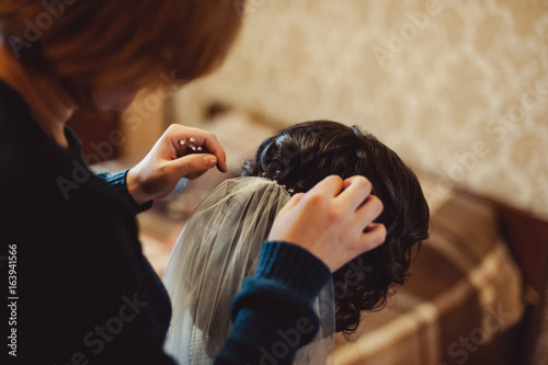 © ViDi Studio, Naklejka premium The bride is wearing a veil. Beautiful long veil of white color
