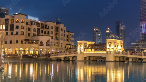 Fototapeta premium The bridge near the biggest musical fountain in Dubai day to night timelapse. Dubai, UAE