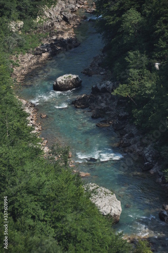 © TRINGA, Naklejka premium The bridge on the Tara River in Montenegro and the bridge connecting the two banks of the canyon. A stony bed of a clean river flowing through the valley along the road on a mountain slope.