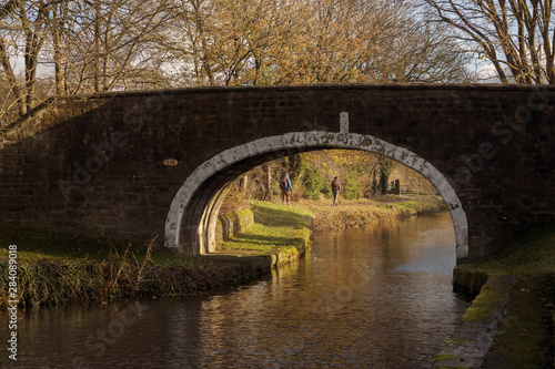 © Richard, Fototapeta premium The bridge over the canal at Dowley Gap frames walkers on the towpath during an autumnal walk