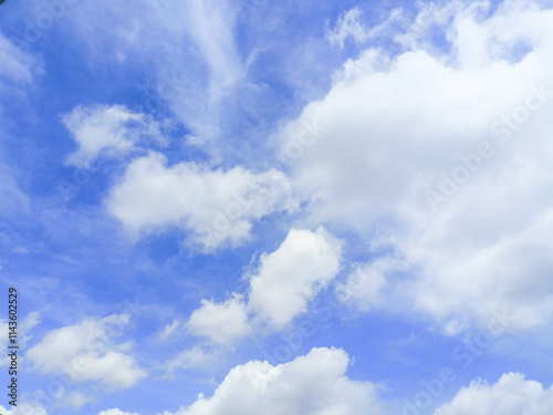 Obraz premium The bright blue sky is decorated with white clouds floating around, creating...