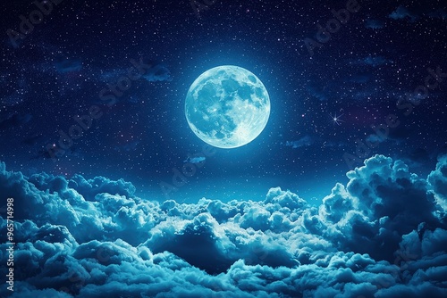 © Fleuronica, Fototapeta premium The bright full moon illuminates fluffy clouds, creating a tranquil atmosphere as stars twinkle in the vast night sky. The scene evokes calmness and wonder