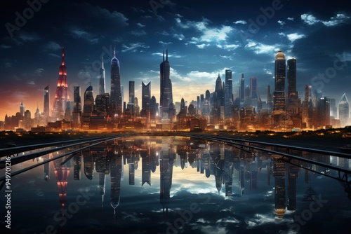 © Emi, Fototapeta premium The bright lights of a cityscape viewed from a high vantage point