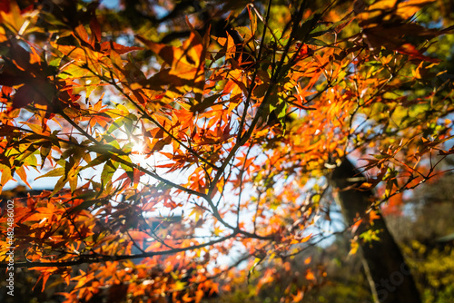 Fototapeta premium The brilliant colors of fall in Japan with sunlight on the grounds of the...