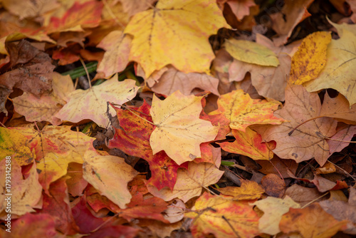 Fototapeta premium The brilliant colours of autumn leaves captured while hiking along a river in Toronto, Ontario, Canada.