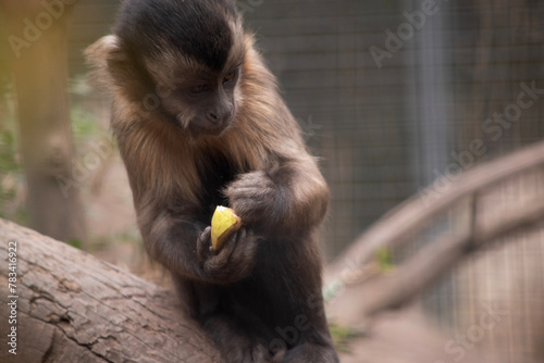 Fototapeta premium The brown capuchin has brown, thick fur with a dark wedge on the forehead and lighter face, cheeks and chin.