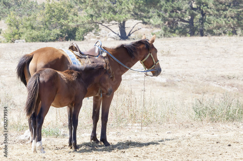 © a_andreev, Obraz premium the brown horse who is grazing on a green meadow