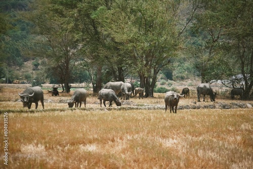 © QUACH TUNG DUONG, Fototapeta premium The buffaloes gazing grass in a hot day.
