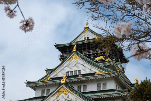Fototapeta premium The building exterior of the beautiful acient Osaka Castle framed by pink flowers of cherry trees outdoor at daytime during spring in sakura season in Osaka in Japan.