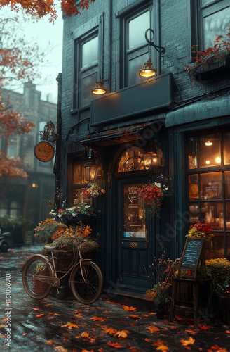 © Vadim, Naklejka premium The building has a bike rack outside and a potted plant on the sidewalk. The front door is open and there is a bench outside