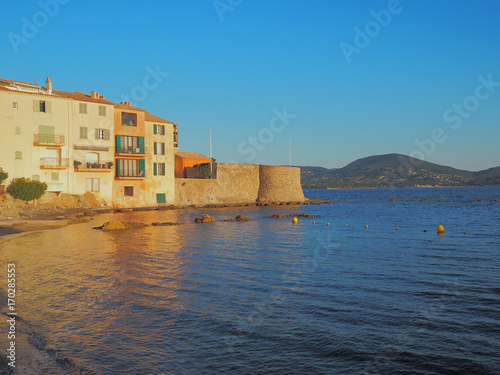 Fototapeta premium The buildings along the coastline of Saint Tropez, on an early summer morning.