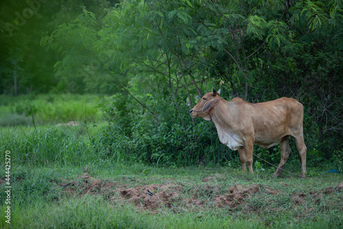 Fototapeta premium The bull stood facing the field. In the back, there are many trees, lush...