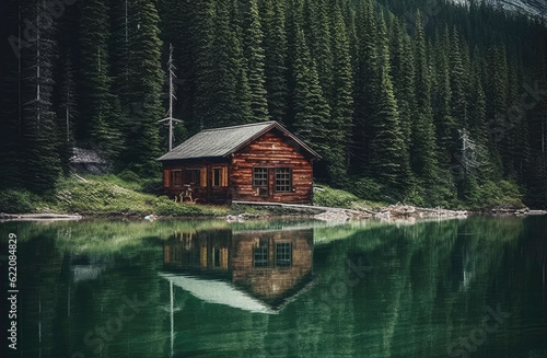 Fototapeta premium The cabin is in front of the woods by the lake, AI generated