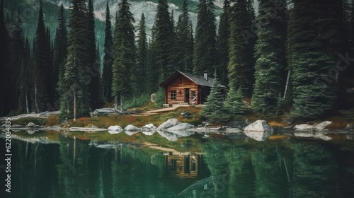 Fototapeta premium The cabin is in front of the woods by the lake, AI generated